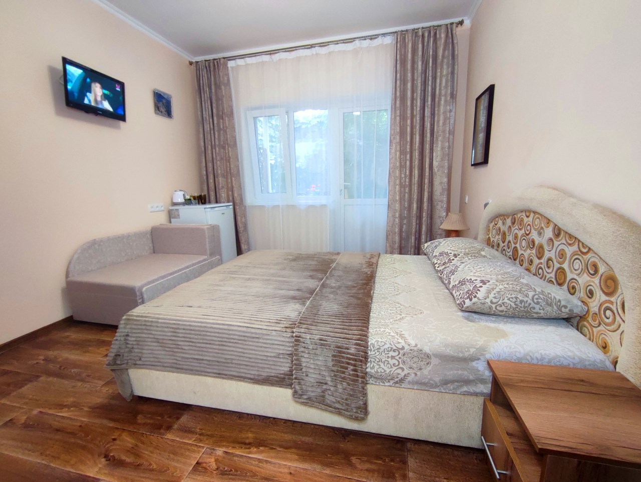 Напротив каждого номера отдельный столик для отдыха. Кухня, стиральная машина, мангал. Ухоженный двор, утопающий в зелени винограда, деревьев граната и множества цветов.