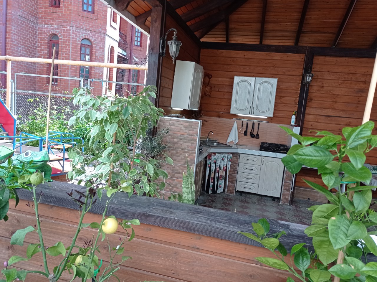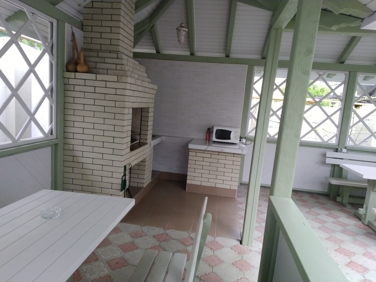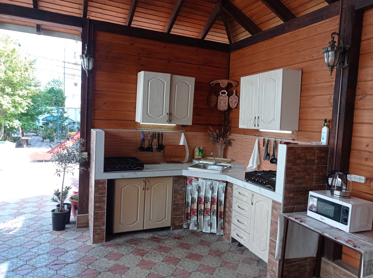 Во дворе гостевого дома имеется полностью оборудованная кухня для самостоятельного приготовления пищи и уютная беседка в саду для шашлыков.